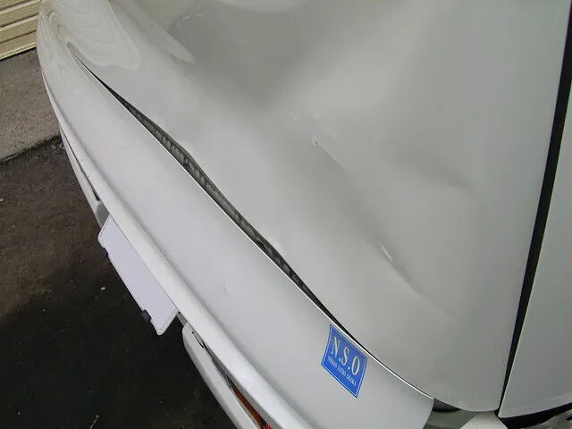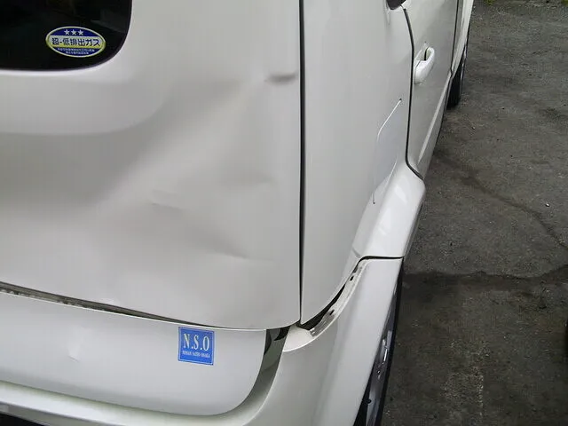 後方を衝突されたようで、バックドアに大きなへこみが見られますね。