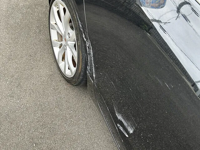 黒いボディなのもあり、右リアドアからリアクォーターパネル(フェンダー)にかけての白い擦り傷が目立ちますね。板金塗装で綺麗に修復いたしますのでご安心ください。
