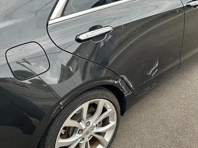 堺市のお客様より、キャデラックの右リアドア・リアクォーターパネルのキズ・へこみ修理のご依頼をいただきました。
