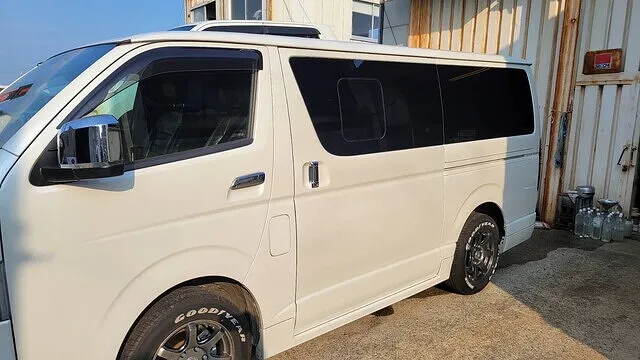 特にハイエースのホワイトパールは光の加減で色の差が出やすいため、差異が出ないよう丁寧な仕上がりを実現。