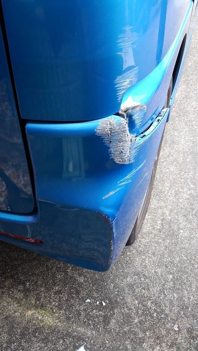 右後方を壁に接触させてしまい、リアバンパーが大きく割れて変形し、クオーターパネルにも深いヘコミと擦り傷ができていました。