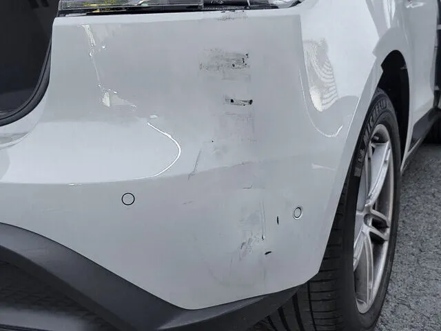 損傷状況を確認すると、バンパー表面には黒い擦り跡と塗装剥がれが複数あり、一部には浅いへこみも見られました。