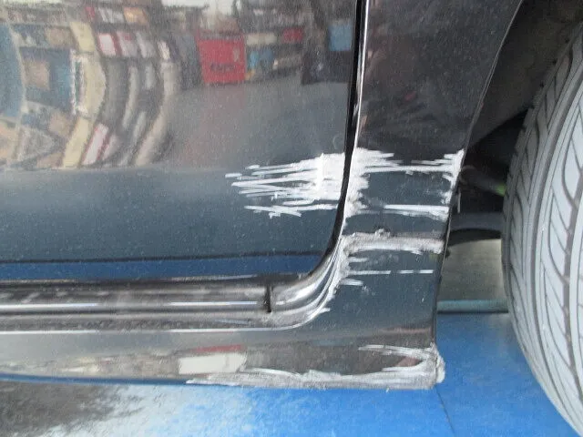 まずは、リアドアとサイドステップのヘコミを埋めるため鉄板を切り継いで溶接をしてパテを塗布。