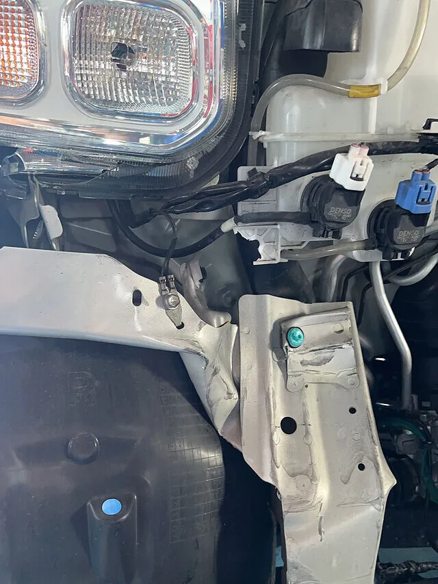 さらに左ヘッドライトはレンズ下部が割れ、取り付け部分まで損傷が及んでいる状態でした。