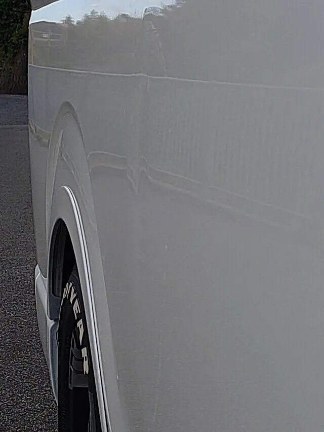 ハイエースのように側面が広い車は、小さなヘコミでも意外と目立ってしまいますが、適切な板金処理と塗装を行えば、きれいに復元することが可能です。