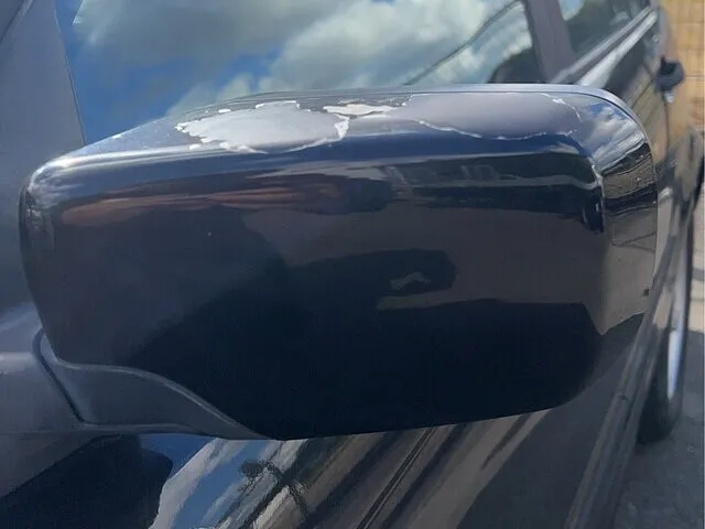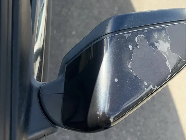 ドアミラー表面の塗装が白く斑点状に浮き、クリア層が剥がれてきている状態でのご入庫。