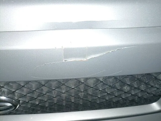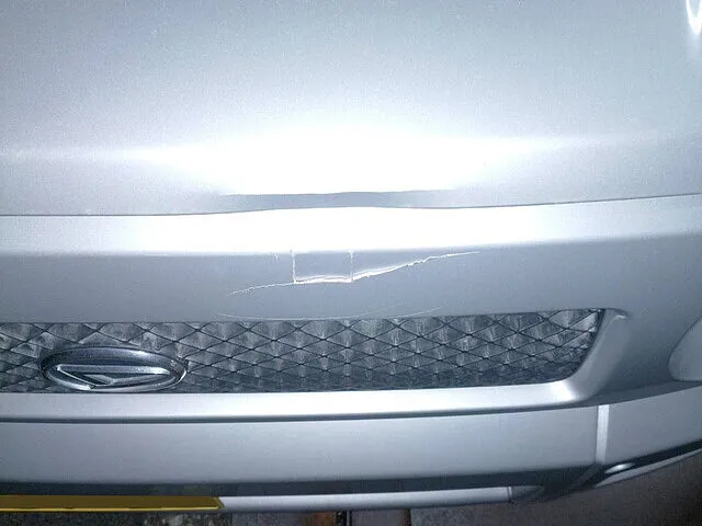 特にバンパー上部には塗膜が裂けたような損傷があり、樹脂バンパー特有の変形も確認できる状態。