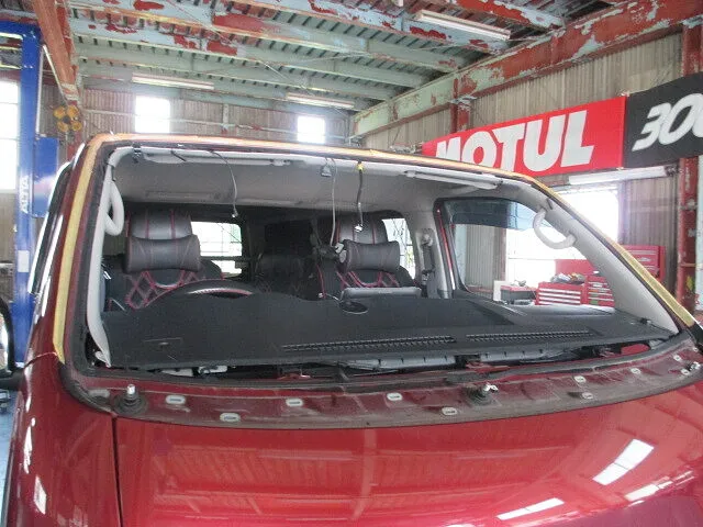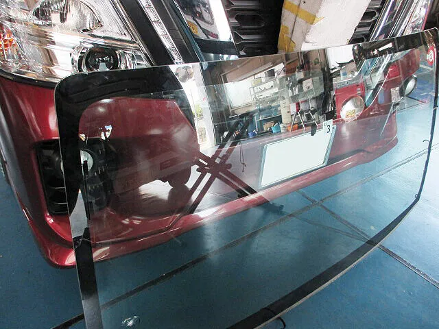 ボディを傷付けないように、割れているフロントガラスを慎重に取り外します。続いて、取り寄せた中古ガラスを取り付けて作業完了です。